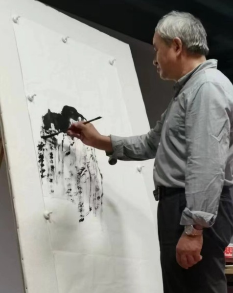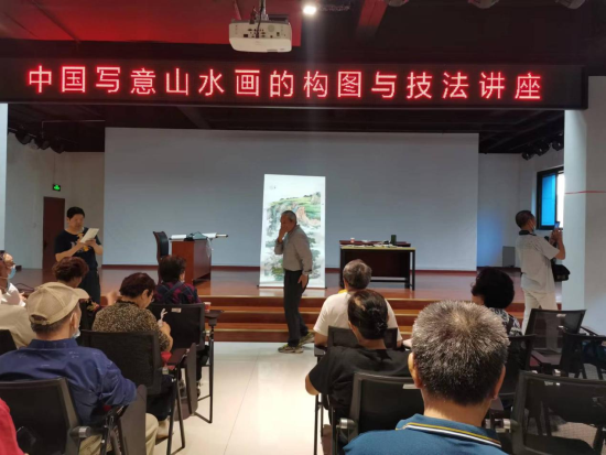 讲座开始,他把自己的佳作带到现场一一展示,紧接着又从作画构图写意与技法技艺作了现场讲解,随后又用近一小时的时间,现场非常熟练的创作了一幅栩栩如生的山水图,参训者无不称道,並争先恐后上前拍下这幅佳作,更有甚者涌到画前,用画作背景,留下了珍贵的纪念照。
