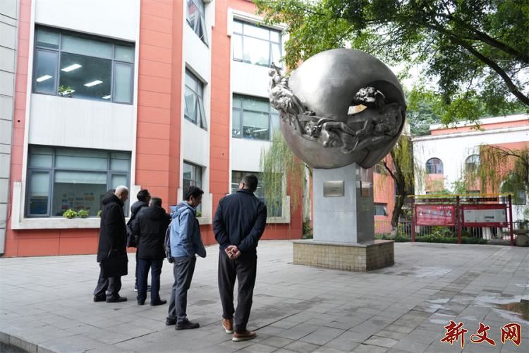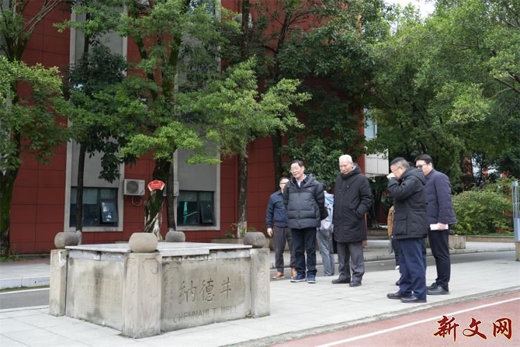 从镌刻有“重庆八中”的校门出发,党委书记曾奇引导专家组查看了“树人”系列文化展板,介绍了学校的历史传承与科学城校区发展规划。随后,专家组实地考察了抗战遗址“纳德井”和校园雕塑《二十一世纪畅想曲》,了解其保护情况及教育意义。