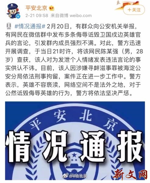了解到这可歌可泣的英雄事迹,国人无不肃然起敬,深深地为这“宁肯高原埋忠骨,决不丢失一寸土”的英雄气概所震撼。然而,却有一些不和谐的声音在互联网平台上公然恶意歪曲事实真相、诋毁贬损戍边英雄,这样的出格行为,伤害了国人感情,触犯了法律红线,引发了群众不满,人民群众纷纷向公安机关举报 ,警方迅速展开调查,对不法分子以涉嫌寻衅滋事罪刑事拘留。