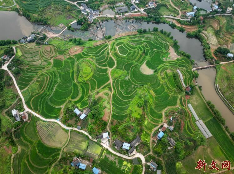 从空中鸟瞰重庆市璧山区乡村振兴项目——云雾花涧·万亩梯田一期(以下简称:云雾花涧)农业核心区,层层叠叠的梯田,阡陌纵横,线条优美流畅,梯田与山间、村落、道路相映成趣,描绘出一幅独特的田野画卷。