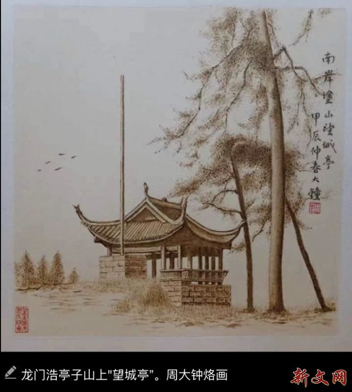 见我如此专注,初见便豪爽问我喜欢什么画,我有意考考他,说我是下浩人,下浩后山有一座“望城亭”毁于特殊年代,你能不能“烙”。他一听说是消亡的古迹,以极大兴趣忙问先生有照片没有,随即我将手机里储存的照片发给他,见后他豪爽地说半月后“交卷”。大钟先生是个重情重义、十分守诺的人,果不其然,半月后他把一帧几乎与照片无异,用38X38卡纸烙成的“望城亭”送到我家。恰好我著《故城遗痕》一书正在编辑中,欣喜作为《亭子山上扬眉吐气、庆胜利脚踩膏药旗》那篇文章的精彩配图。