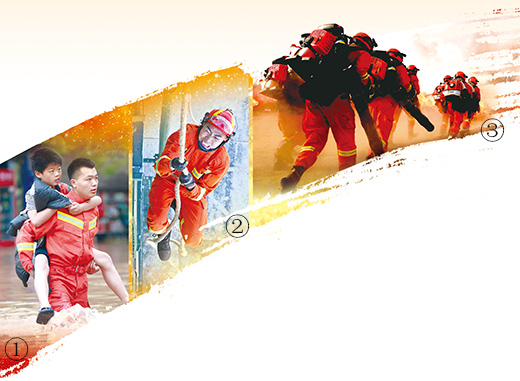 图①:今年6月底,受暴雨影响,重庆市龙潭河沿线地区被淹。图为消防队员踏水背出受困群众。肖乐峰摄(人民视觉) 图②:在山东省烟台市消防救援支队培训基地,消防队员正在参加绳索攀爬比赛。孙文潭摄(人民视觉) 图③:今年5月,甘肃省森林消防总队张掖支队开展了实战灭火演练。图为消防队员奔赴演练火场。张小军摄(人民视觉)