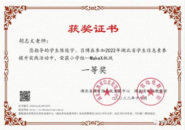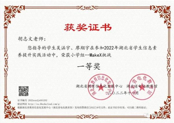 据悉,湖北省学生信息素养提升实践活动是由湖北省教育信息化发展中心和湖北省电化教育馆联合主办。此次活动以“实践、探索与创新”为主题,共设有数字创作类、计算思维类、科创实践类(含创客、人工智能和智能机器人项目)三大类项目。旨学生创作、分享的实践操作过程中,培养学生的探索精神、激发学生的创新热情,丰富学生的学习生活和课余时间。
