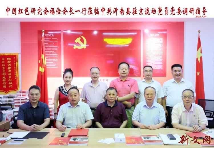 新文网-北京讯(图文/郭幸福)9月4日下午,中国红色文化研究会副会长张福俭、胡澄、胡呈军、中国文联民间文艺中心主任刘加民、光明磊落展览馆馆长张宝权等一行六人到沂南县驻京流动党员党委开展调研座谈活动。此次活动以“弘扬沂蒙精神,传承红色文化”为主题,旨在深入探讨红色文化传承与党建工作的融合发展。