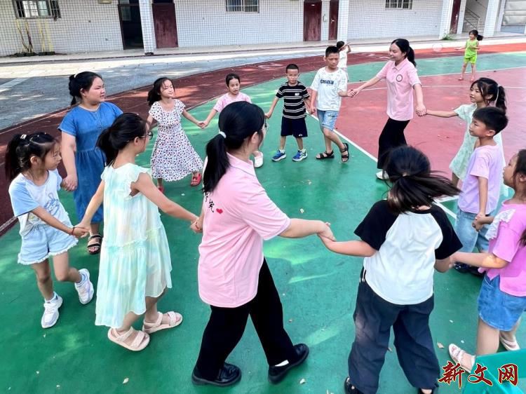 当天下午,校园操场化作了欢乐的海洋。志愿者们精心组织了充满互动与欢笑的集体游戏—“桃花开几朵”。随着志愿者清脆的口令声:“桃花桃花开几朵?”孩子们一边兴奋地回应:“开几朵?”,一边紧张又期待地等待着答案。当数字“X朵!”喊出的瞬间,孩子们立刻欢笑着、雀跃着,迅速寻找伙伴抱团成组。游戏中此起彼伏的欢声笑语、奔跑寻找的雀跃身影、成功组队后的击掌拥抱,构成了一幅生动活泼的画卷。