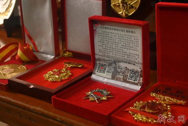 图为沈老展示军人荣誉勋章(部分)。