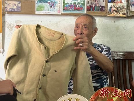 图为沈老展示抗战时所穿棉衣。