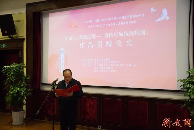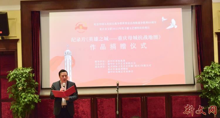 新文网-重庆讯(图文/陈金山)11月26日,纪录片《英雄之城——重庆母城抗战地图》作品捐赠仪式在重庆史迪威博物馆举行。渝中区委常委、统战部部长李兴建,渝中区文联主席刁涛,史迪威研究中心主任陶燕等领导嘉宾出席活动。作品捐赠仪式由该片总导演萧斐主持。