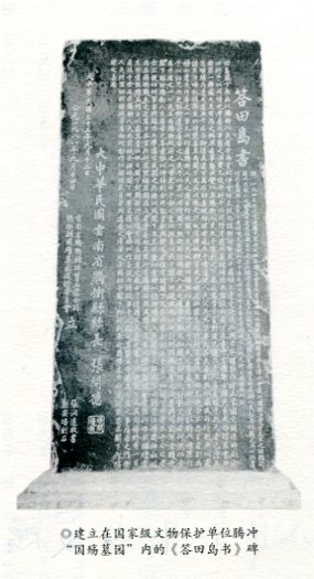 这有些出乎我的意料。我对张问德县长倒是久闻大名:1942年5月10日日寇入侵腾冲,6月5日,62岁的张问德先生参加腾冲抗日临时县委,7月2日临危受命担任县长。1942—1944年的两年中,不顾年迈体弱,经常随军行动,带领民夫上前线,八次翻越高黎贡山,六次渡怒江,俨然投笔从戎的老黄忠。他的“答田岛书”更被当时全国各大报刊全文登载,他也成为有口皆碑的“抗日县长”、“沦陷区骨头最硬的县长”。