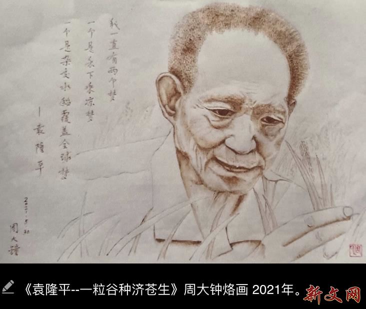 大中先生虽已年过古稀,但仍然不甘平庸,给自己加压,拓展“烙画”跨度、提高“烙画”水平、培养更多“烙画”爱好者、让非遗“烙画”进入千家万户,他以别样的气度和情怀,涵养中华优秀文化并与时俱进。而今大钟先生不少作品格调高雅、想象丰富、意境优雅、形神兼具。而今花鸟鱼虫对他来说那简直是信手拈来,山水、人物、遗迹也能熟练驾驭。他关注社会、留意身边大事,努力创作具有时代影响力和人文价值的作品。世界杂交水稻之父、共和国勋章获得者袁隆平仙逝,他夜以继日烙制出《一粒谷种济苍生》以示崇敬缅怀。
