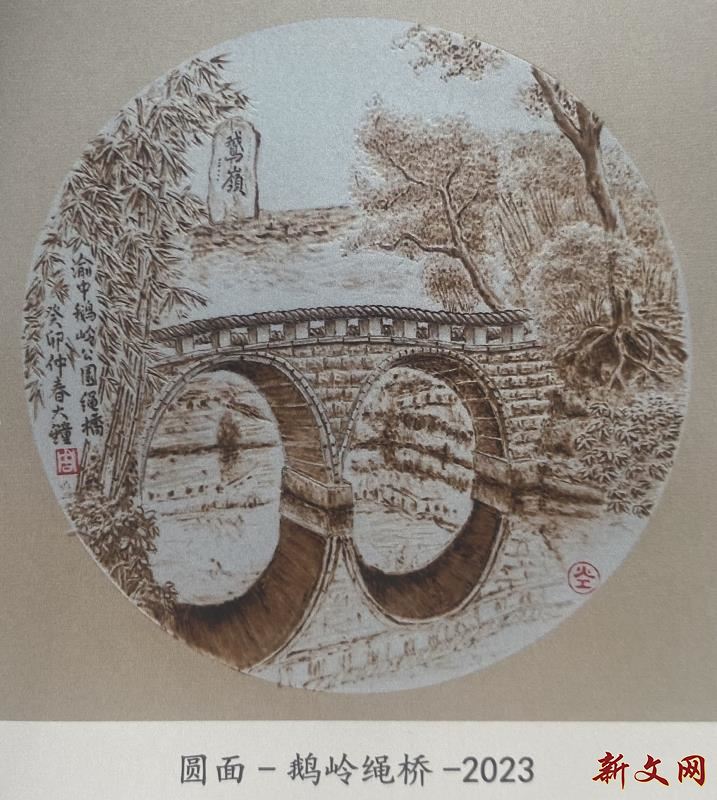 见我如此专注,初见便豪爽问我喜欢什么画,我有意考考他,说我是下浩人,下浩后山有一座“望城亭”毁于特殊年代,你能不能“烙”。他一听说是消亡的古迹,以极大兴趣忙问先生有照片没有,随即我将手机里储存的照片发给他,见后他豪爽地说半月后“交卷”。大钟先生是个重情重义、十分守诺的人,果不其然,半月后他把一帧几乎与照片无异,用38X38卡纸烙成的“望城亭”送到我家。恰好我著《故城遗痕》一书正在编辑中,欣喜作为《亭子山上扬眉吐气、庆胜利脚踩膏药旗》那篇文章的精彩配图。