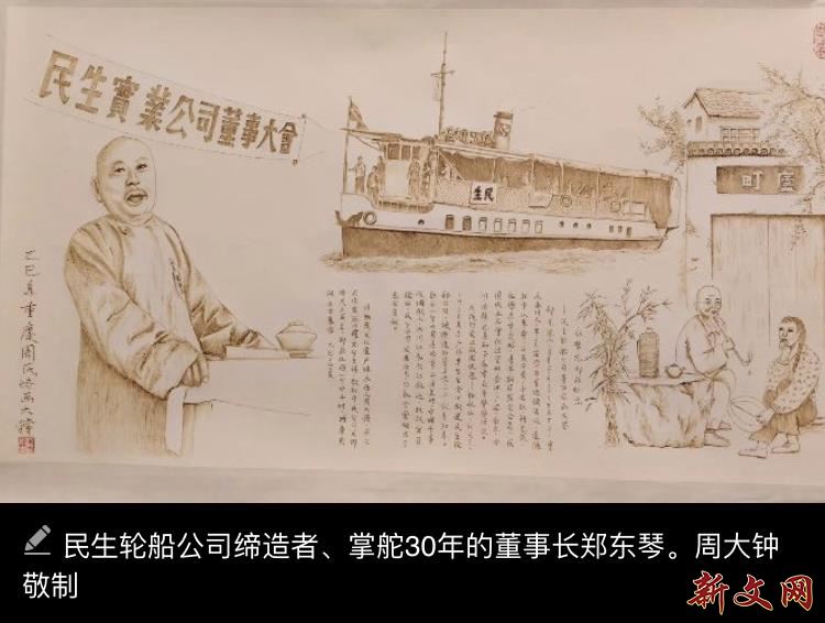 今年是民生轮船公司成立百年,抗战胜利80周年,与卢作孚共同创建民生轮船公司的郑东琴逝世一个甲子。为了纪念郑东琴先生为实业兴邦鞠躬尽瘁,一以贯之担任民生公司董事长整整30年,率领民生轮船公司在抗战物资、人员抢运和建国初期为恢复经济建设“公忠体国、造福人民”做出杰出贡献的“郑公”,大钟先生根据《重庆晨报》的报道,精心烙制了三尺整纸《民生公司的缔造者掌舵人--郑东琴》以茲缅怀。