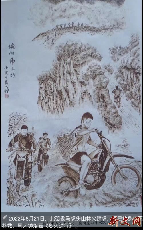 大钟先生被以“龙麻子”为代表的千余名志愿者骑手,驾着自己的私家摩托车,有的放弃挣钱养家、有的放下照顾病中父母、有的放弃婚期……奋不顾身、明知危险、偏向火灾现场奔驰,一趟又一趟把灭火人员、装备、生活物资抢运到火灾现场的场景事迹感动,他决定用“烙画”展现“烈火逆行”的英雄。