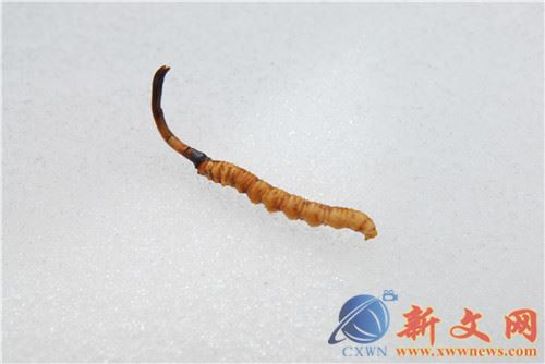 【性状】本品由虫体与从虫头部长出的真菌子座相连而成。虫体似蚕,长 3~5cm,直径